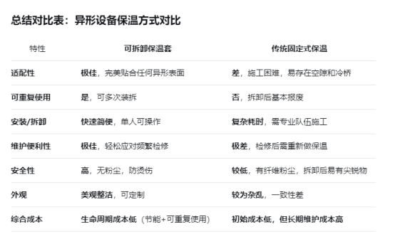 對(duì)于形狀不規(guī)則、需要頻繁維護(hù)或檢修的異形設(shè)備,使用可拆卸保溫套不是一種簡(jiǎn)單的替代選擇,而是一種在保溫效率、維護(hù)便捷性、安全環(huán)保和長(zhǎng)期經(jīng)濟(jì)效益上都具有壓倒性優(yōu)勢(shì)的現(xiàn)代化解決方案。它特別適用于石油化工、制藥、食品飲料、電力、新能源等對(duì)工藝溫度控制和設(shè)備維護(hù)要求高的行業(yè)。